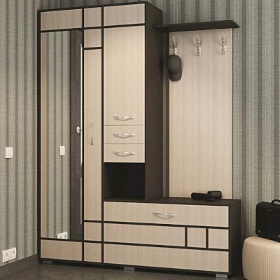 Состоит из полки с крючками, тумбы и шкафа с выдвижной штангой.