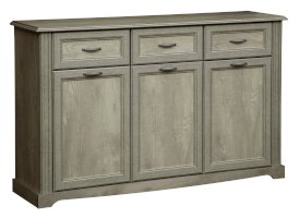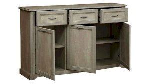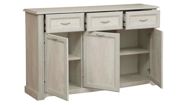 Строгая геометрия данной модели тумбы покоряет и притягивает. Здесь все четко: три выдвижных ящика сверху и четко под ними три дверцы, за которыми расположены отсеки с полками. Справа две распашные дверцы открываются навстречу друг другу - с более широким отсеком и двумя вместительными полками из ЛДСП. Слева, за одной дверцей, представлен блок в два раза уже, но также – с двумя полками. Каждая из полок выдерживает вес до 5 кг.