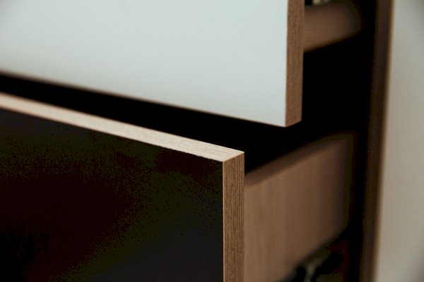 2. Фасады обрамлены цветной кромкой Ясень шимо светлый.