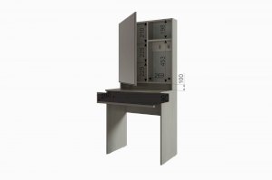 Под столешницей находится большой выкатной ящик на шариковых направляющих, в котором разместятся много важных вещей.