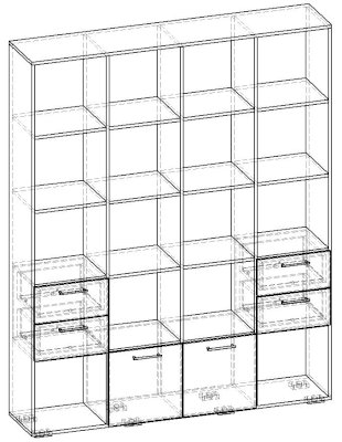 Применение задней стенки из ЛДСП (в ячейках с ящиками и фасадами) позволяет использовать данный стеллаж для зонирования пространства (чтобы предотвратить опрокидывание, необходимо обеспечить крепление стеллажа к стене).