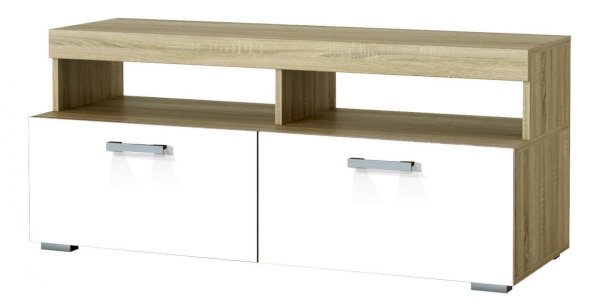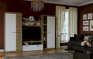 В гостиной Соната применяются современные европейские декоры: корпус выполнен из ЛДСП Дуб сонома, фасад из ЛДСП Белый глянец. Декоры отличаются выраженной тёплой древесной текстурой, а фасадная часть подчёркнута горизонтальными линиями текстуры и стильными планками МДФ, представляющими собой элементы корпуса и фасада.