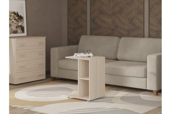 Практичная подставка к дивану - отличная альтернатива классическому журнальному столу. Изделие небольшое и мобильное. Его можно приставить к дивану и организовать небольшую обеденную. Приставьте изделие к стене – и это уже удобная тумба. Интересная конструкция дополнена открытыми нишами для хранения любимых книг или журналов.