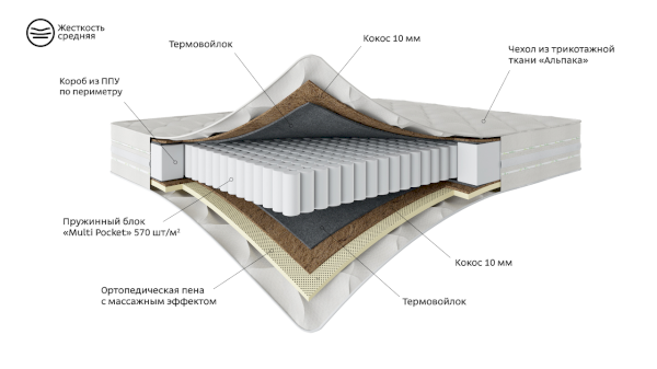 Наполнитель: ППУ, независимый пружинный блок, термовойлок, кокос, ортопедическая пена с массажным эффектом