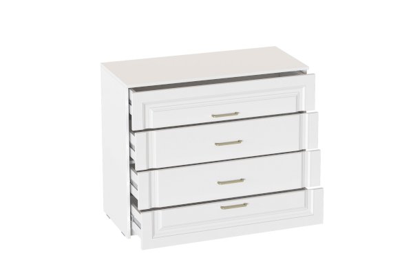 Комод выполнен в цвете Айс 06 / Белый Аляска. Классическая фрезеровка фасадов и ручки-скобы из брашированного золота придают изделию особый шарм и элегантность. Ящики полного выдвижения на шариковых направляющих скользят бесшумно и плавно. Дно и задние стенки выполнены из ХДФ. На опорах размещены войлочные подпятники.