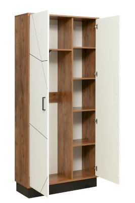 Шкаф скомбинирован так, чтобы учесть все потребности его владельца.  Левый отсек – с верхней полкой-антресолью и отделом, где хранятся вещи. Под полкой располагается металлическая штанга для вешалок. Отличительная особенность шкафа – он достаточно узкий, его глубина составляет 360 мм, поэтому штанга расположена посередине – в виде подвеса, а вешалки располагаются не «в профиль, а анфас». Высота шкафа позволяет развесить вещи разной длины – начиная от коротких рубашек и футболок и заканчивая длинными вечерними платьями в пол.   Правый отсек представляет из себя набор из пяти полок, на которых размещаются сложенные вещи. Каждая из полок выдерживает до 5 кг – это более, чем достаточно.