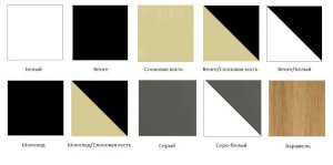 Возможные цвета кроваток: белый, слоновая кость, венге, венге/слоновая кость, венге/белый, шоколад, шоколад/слоновая кость, серый, серо-белый, карамель