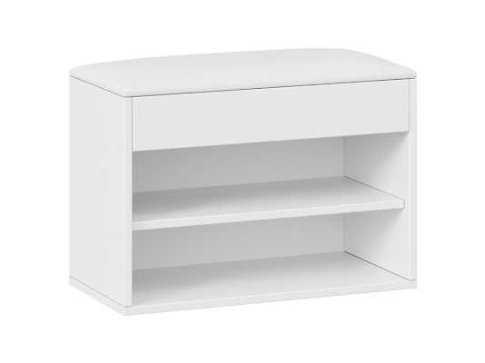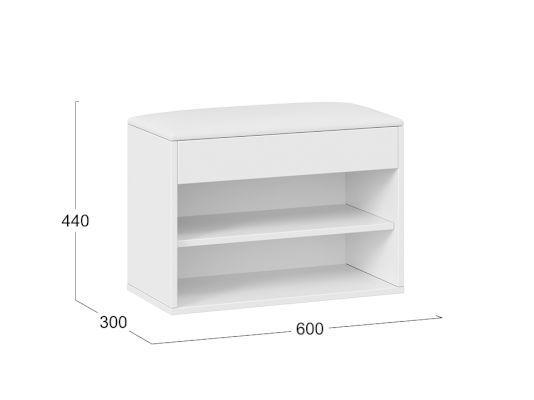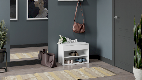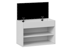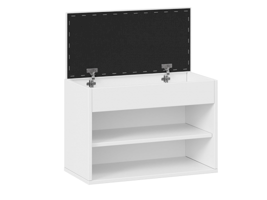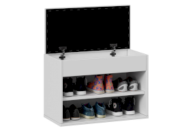 Тумба для обуви имеет открытую нишу для бережного хранения обуви и место под откидной крышкой. Данное пространство можно использовать для хранения обувных аксессуаров и различных мелочей, что без сомнений является преимуществом новинки.