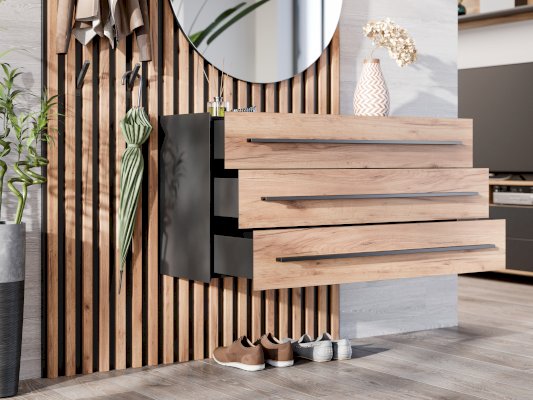 • Внизу тумба с 3-мя выдвижными ящиками на направляющих нижнего крепления полного выдвижения