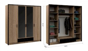 Классический распашной четырехдверный шкаф с дополнительным выдвижным ящиком выполнен в стиле минимализм: строгие черты, функциональность и простота. Контрастный профиль из МДФ 22мм по внешним углам со скругленными краями – максимально безопасное использование мебели. Кромка цвета венге подчеркивает древесную текстуру и рисунок светлого дуба сонома. Зеркала позволяют рассмотреть себя в полный рост, сделают комнату светлее и визуально просторнее. Шкаф легко впишется в обстановку любой комнаты.