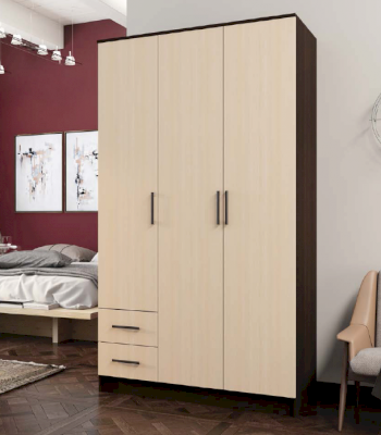 Практичный и функциональный шкаф распашной №5 изготовлен из ламинированной ДСП. Это трехстворчатая модель дополненная двумя выдвижными ящиками. Простой и лаконичный дизайн подходит к любым современным интерьерам. Расцветка и текстура отделки стилизованы под древесину дуба оттенков венге и молочный. Скромная фурнитура отлично сочетается с гладкими, не отягощенными декорированием фасадами.