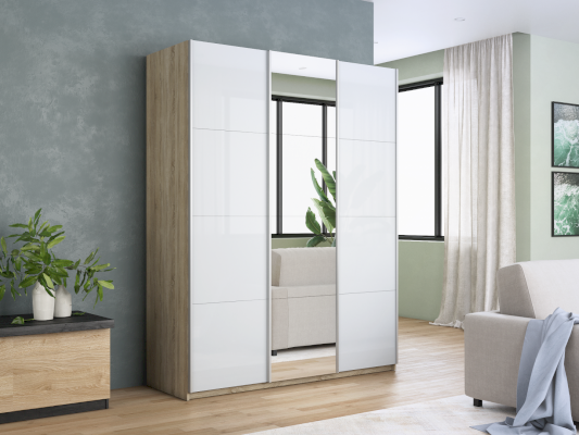 Шкаф-купе 3-х дверный Прайм Белое стекло/Зеркало/Белое стекло 1800х2300х570 мм Сонома