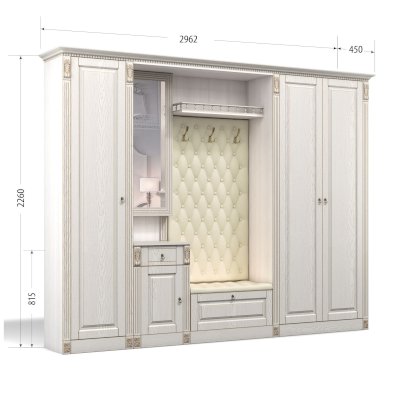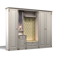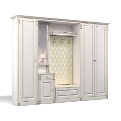 Прихожая выполнена в классическом стиле с декоративными элементами. Фасады и декоративные элементы патинированы, патина наносится вручную, по классической итальянской технологии и защищена матовым лаком. Мягкие элементы (вешалка и сиденье) выполнены из экокожи, декорированы каретной стяжкой.