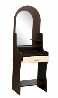 Туалетный стол «Надежда-М07» – изящный предмет мебели, предназначенный для хранения различных средств по уходу за внешностью. Устойчивость конструкции обеспечивают две боковые панели фигурной формы. Силуэт зеркала повторяет форму задней стенки изделия. Несколько открытых полочек позволяют размещать изящные предметы. Для хранения мелких вещей стол оснащён выдвижным ящиком, расположенным под рабочей поверхностью. Свободное пространство в нижней части конструкции и ширина 600 мм позволяют человеку комфортно располагаться перед зеркалом.
