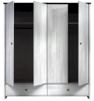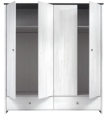 Шкаф разделен на 3 отделения. Внутри шкафа 2 полки и стационарные металлические штанги для одежды. С правой стороны – за распашной дверью отделение с полками. В нижней части шкафа 2 глубоких выдвижных ящика на металлических роликовых направляющих.